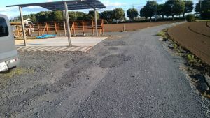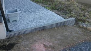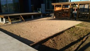 山砂と砂利を敷いて均す作業・土留めブロックの仕上げをしました。