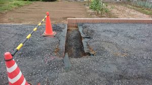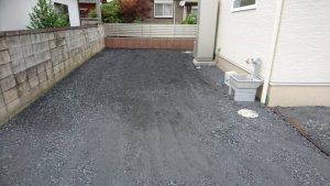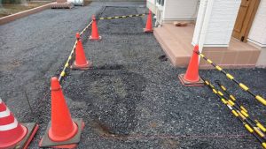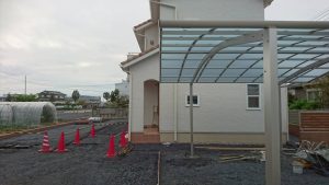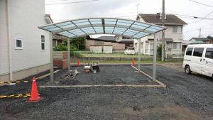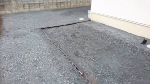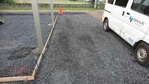 本日は、Ⅽ-40砕石を敷いて均す作業・ブロックベースの掘削作業・土間の枠組み・カーポートを施工しました。