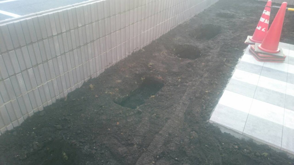 植栽・アクセントポールの掘削、カーポート柱立ての作業と、