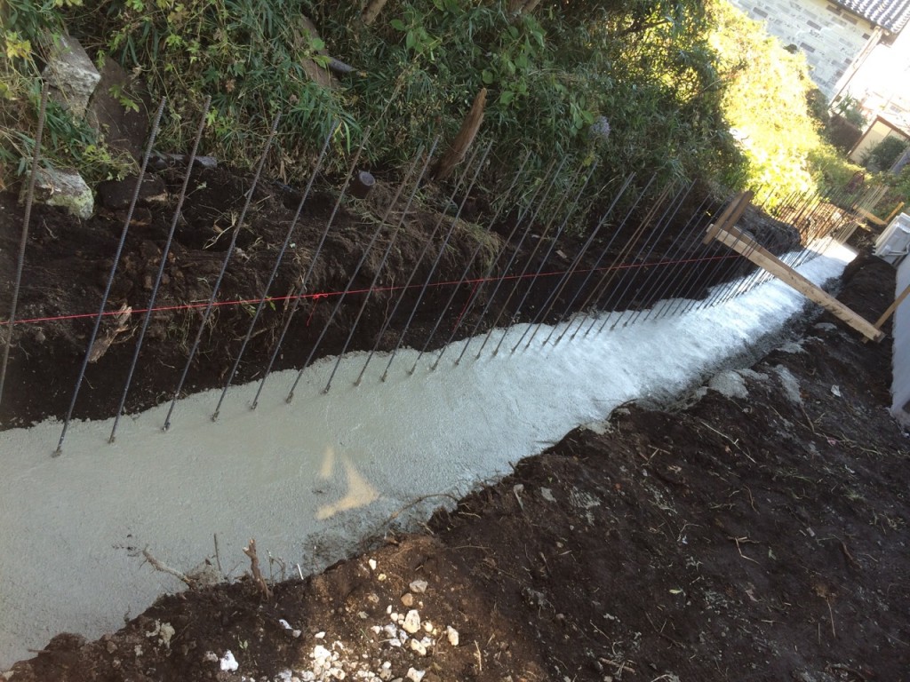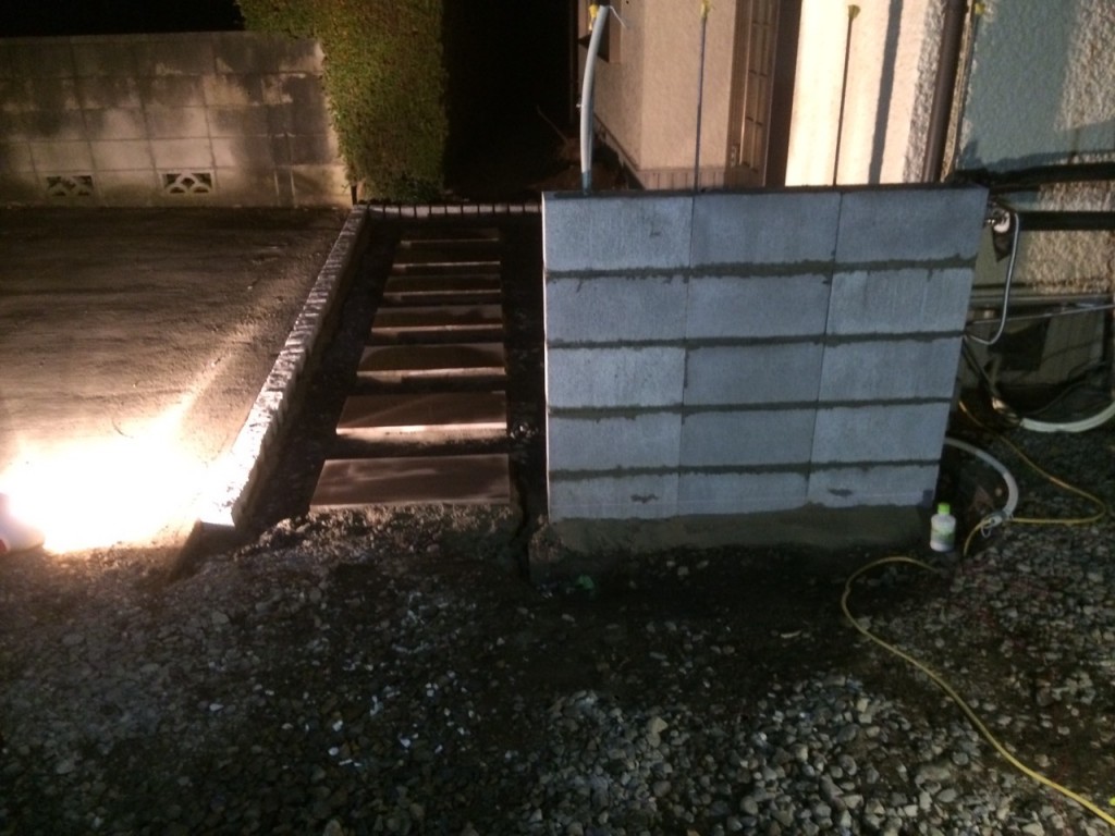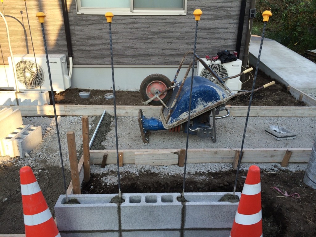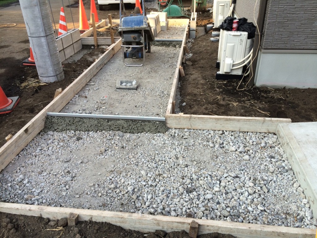 アプローチ部枠組、門柱ブロックベース配筋、打設の作業と、