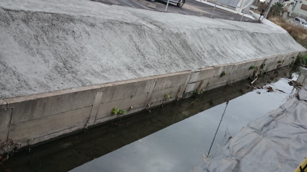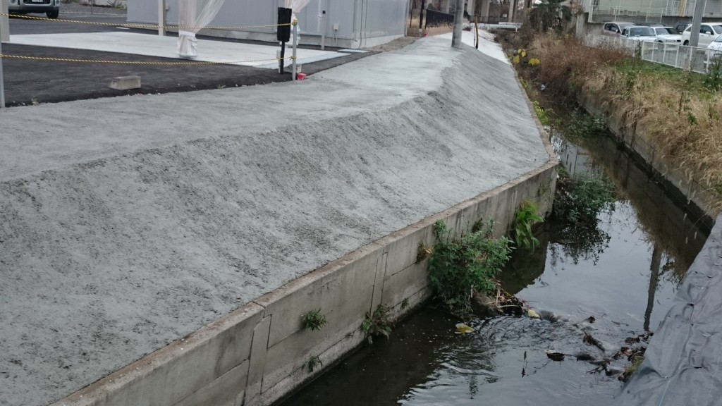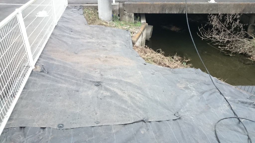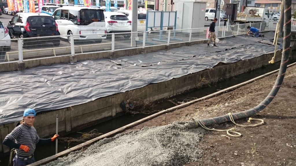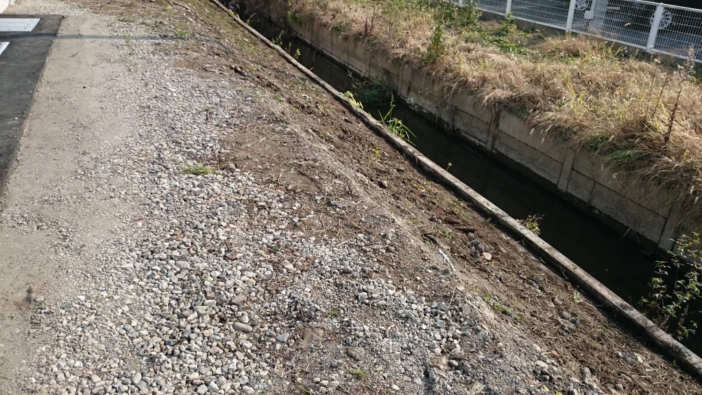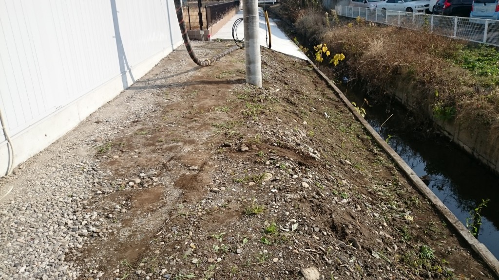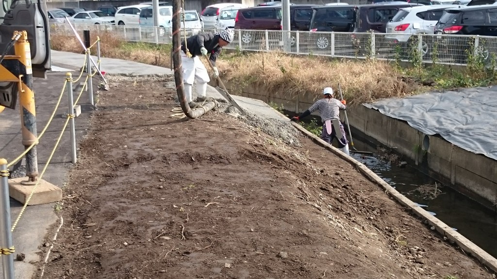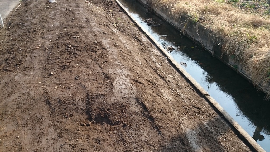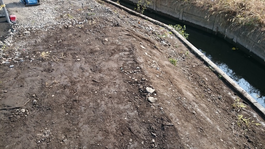 今日は小山市 の、のり面の整地、生コン打設、防草シート敷きの作業と、