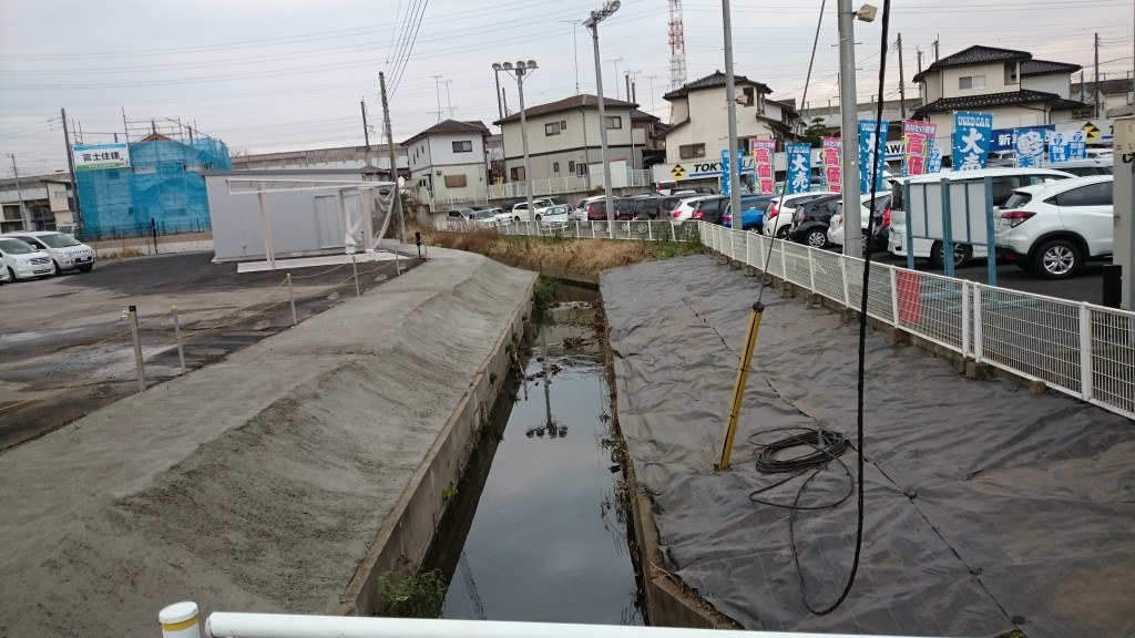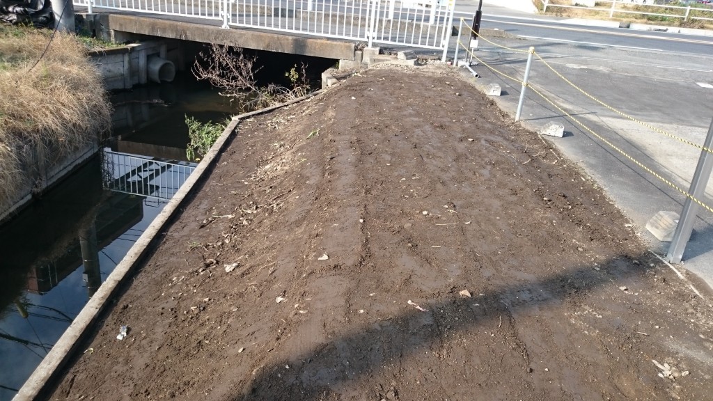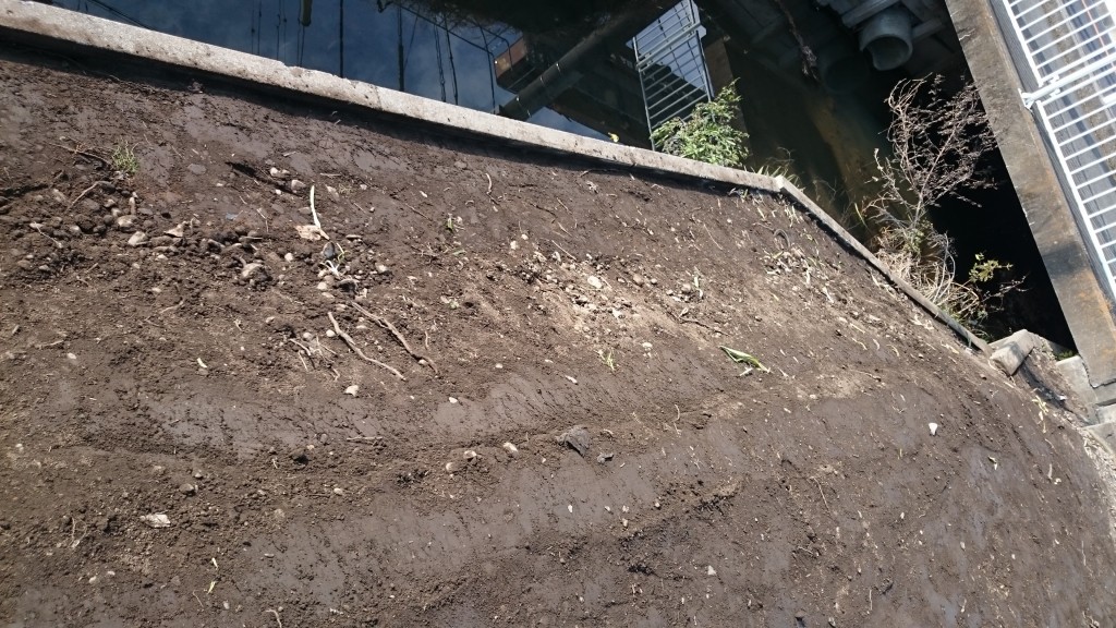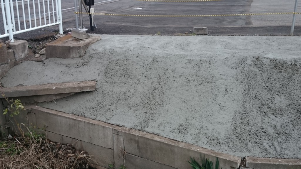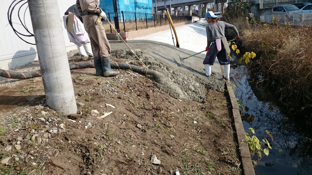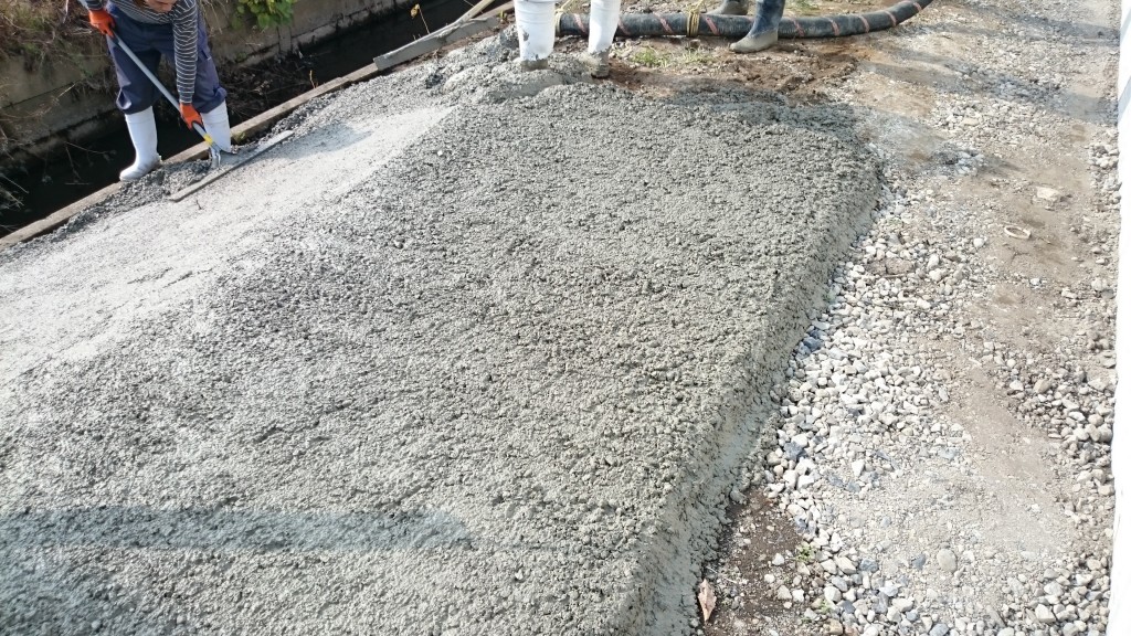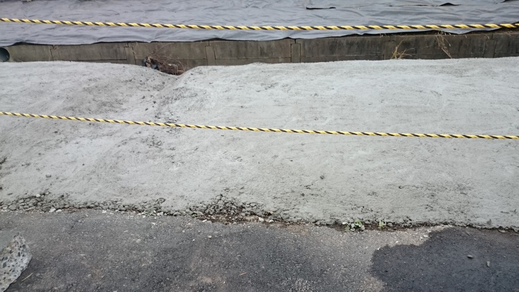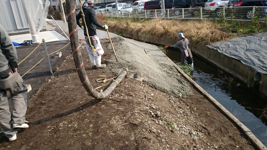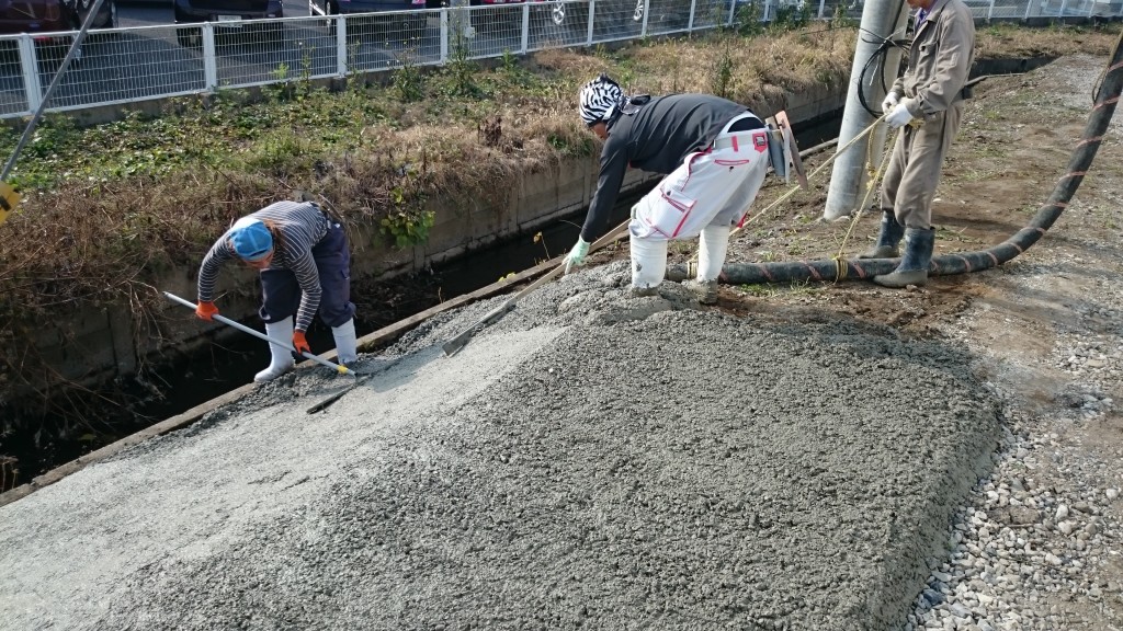 今日は小山市 の、のり面の整地、生コン打設、防草シート敷きの作業と、