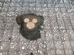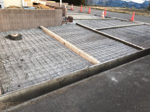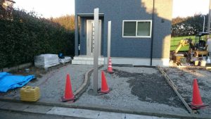 那須烏山市の土間見切りピンコロ、デザイン平板、カーポート柱立ての作業をしました。