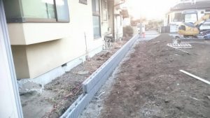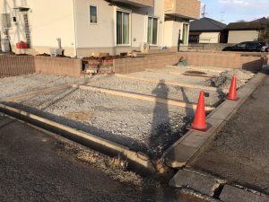 那須烏山市の土間見切りピンコロ敷設、型枠組、カーポート柱部掘削の作業をしました。