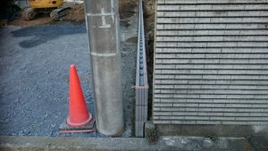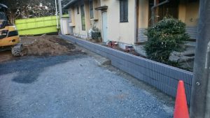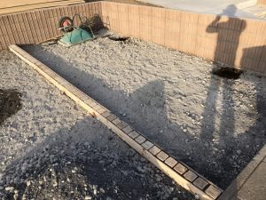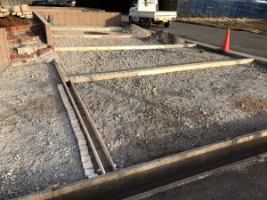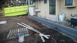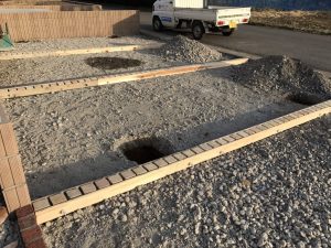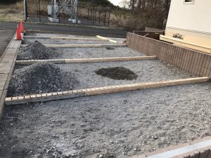 那須烏山市の土間見切りピンコロ敷設、型枠組、カーポート柱部掘削の作業をしました。