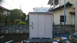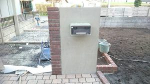今日は宇都宮市 TO町の見切りレンガ、門柱レンガ積、6号砕石敷き、ワイヤーメッシュ敷き、物置組立の作業と、