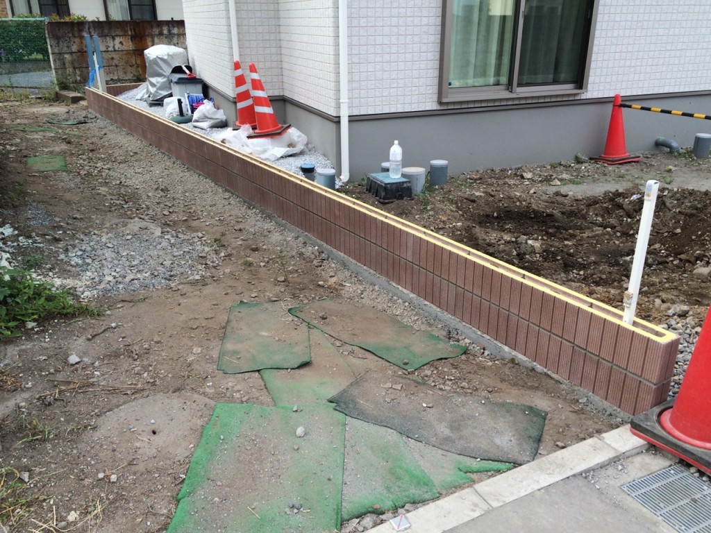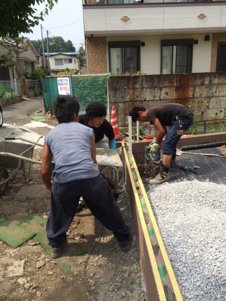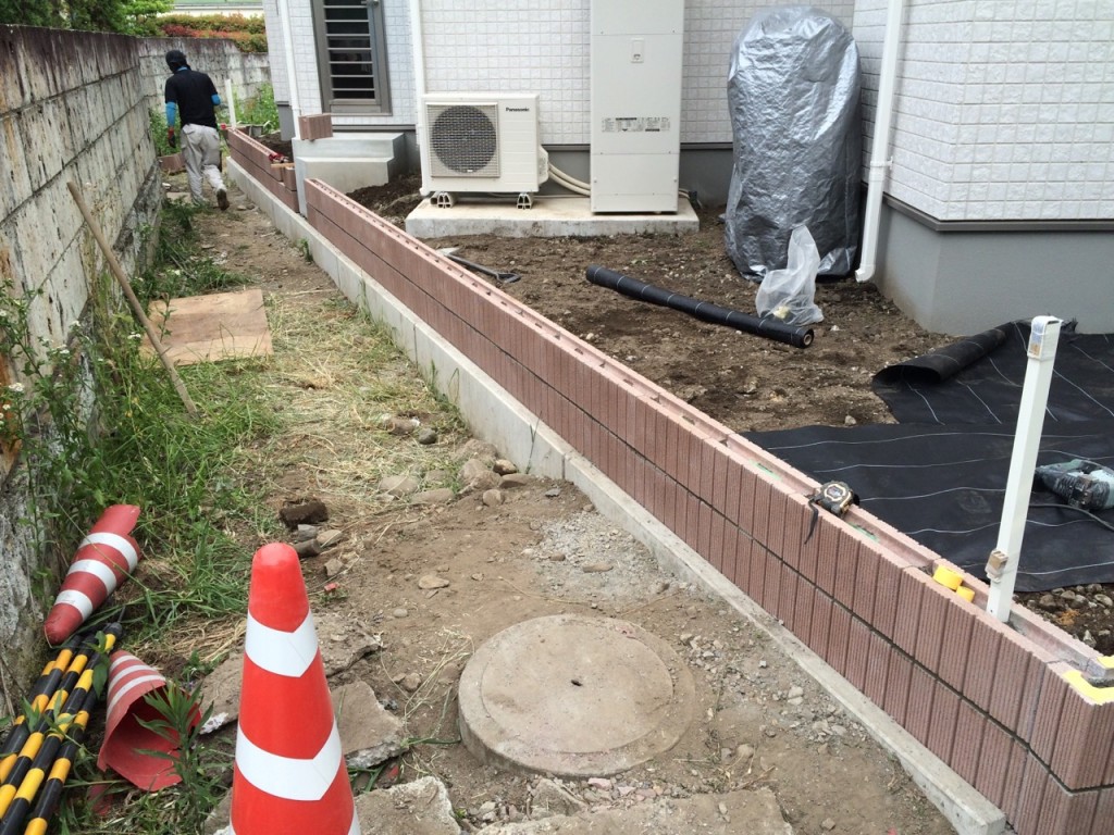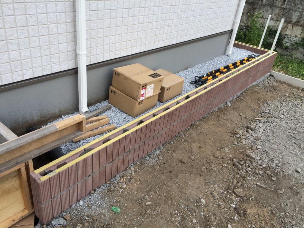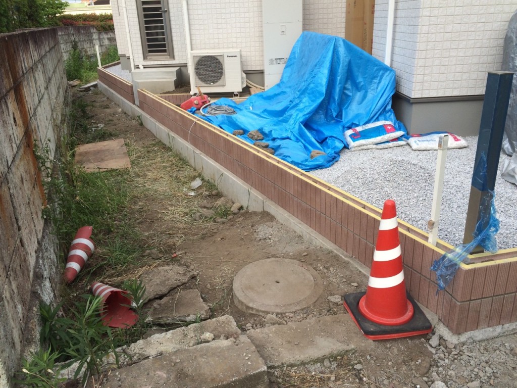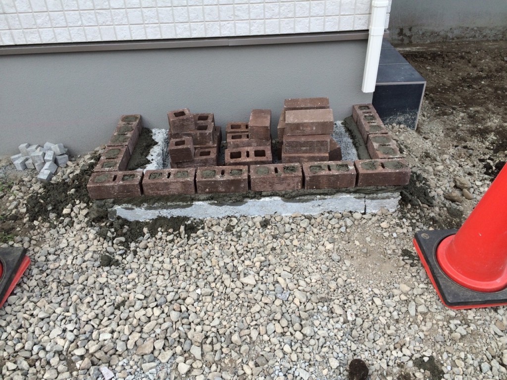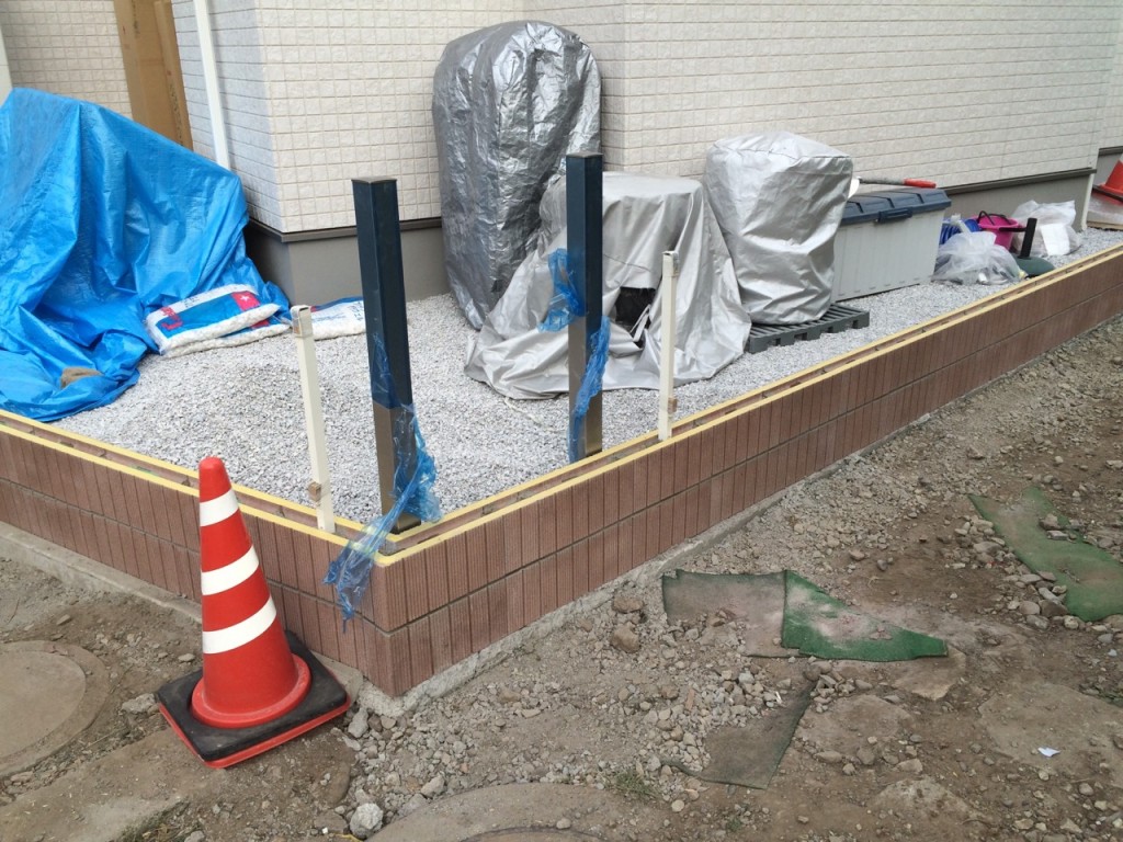 防草シート敷き、6号砕石敷き、ブロック積、門柱前花壇レンガ積の作業をしました。