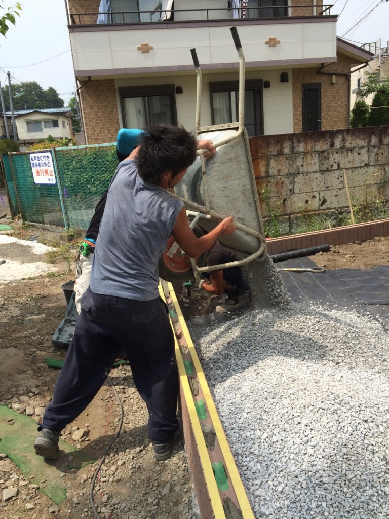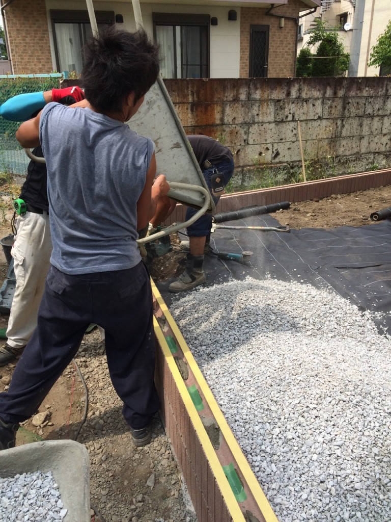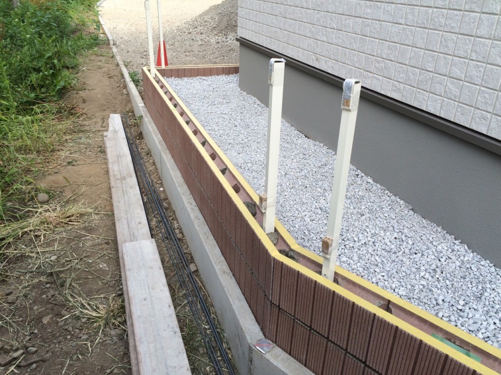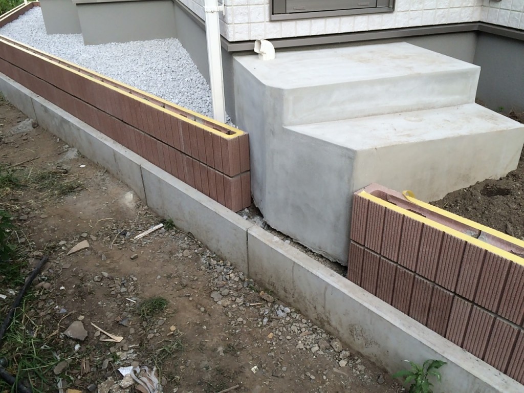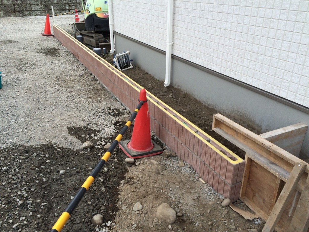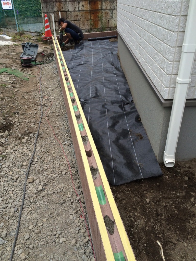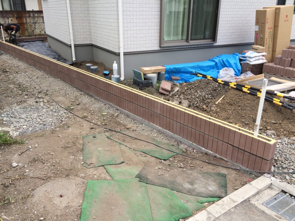 防草シート敷き、6号砕石敷き、ブロック積、門柱前花壇レンガ積の作業をしました。