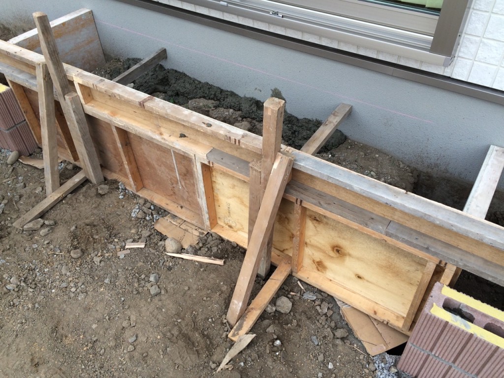 今日は宇都宮市 O町 K様邸の門扉の柱立て、フェンスの柱立て、掃き出し窓前ステップの下地生コン打設の枠組、