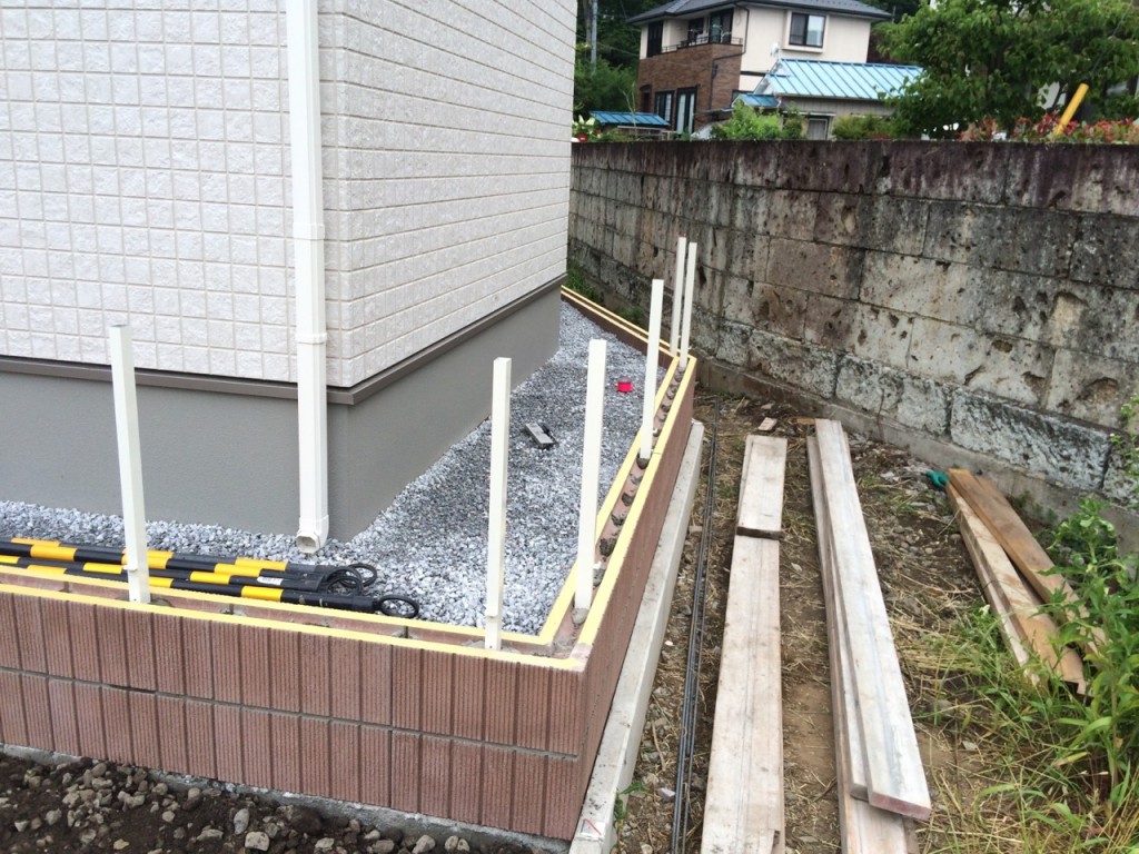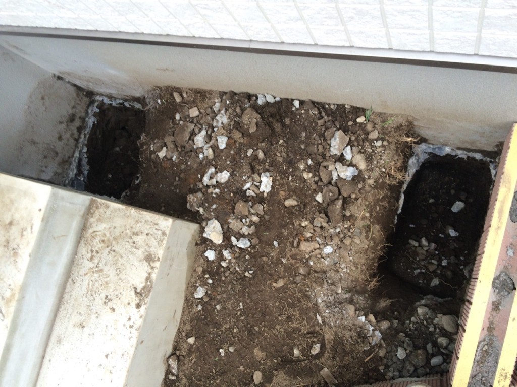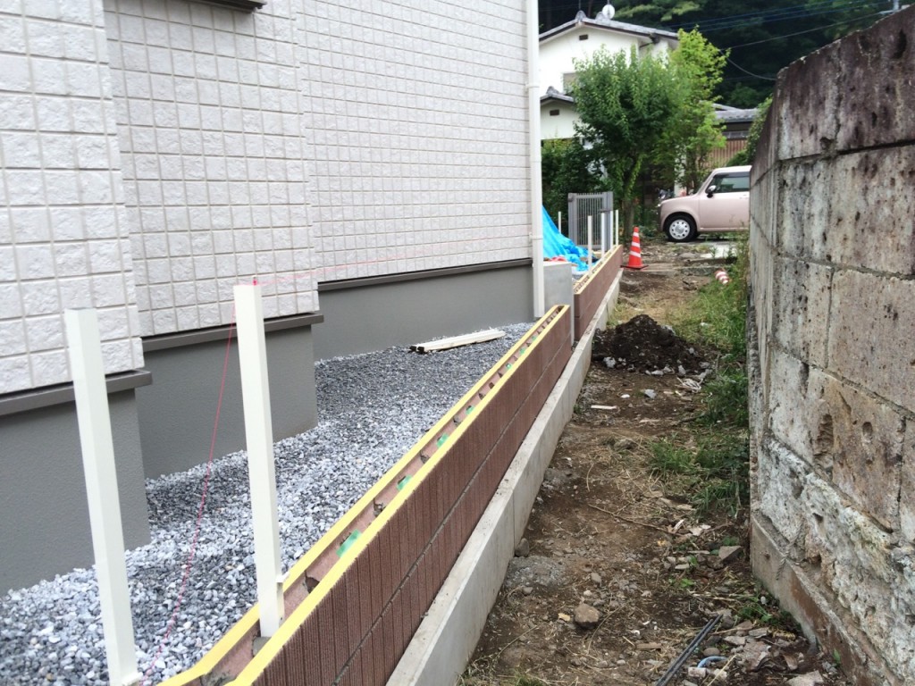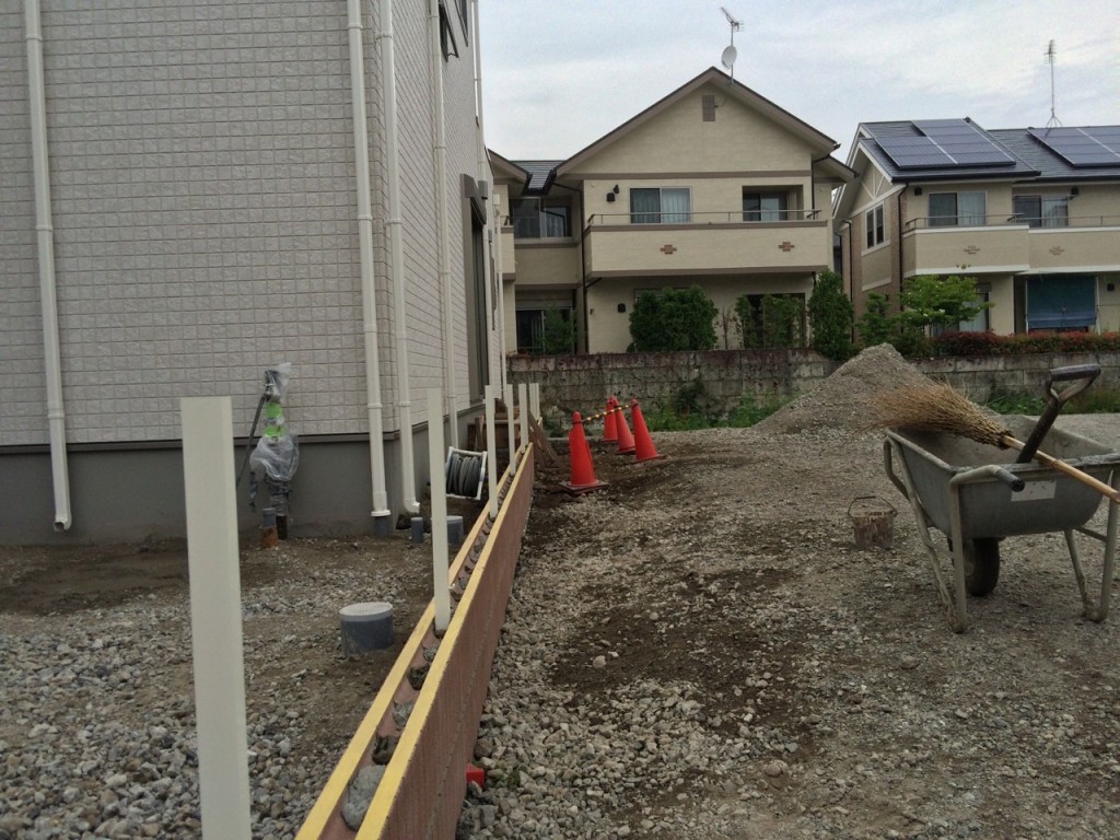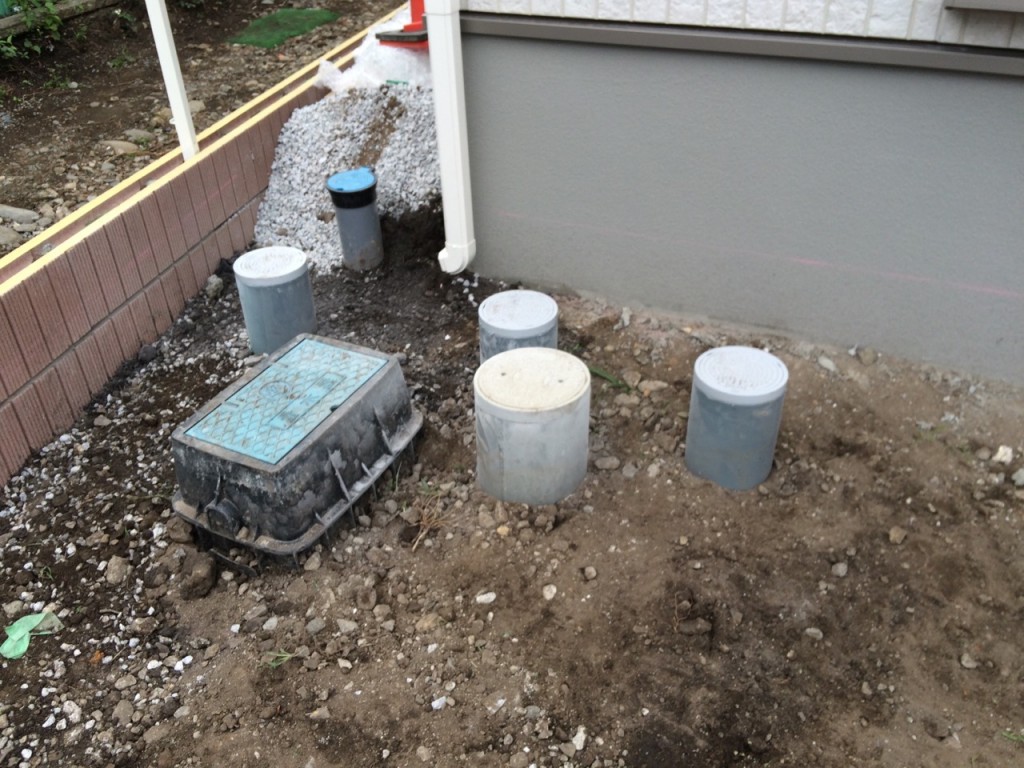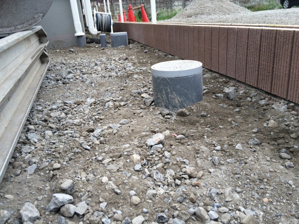 坪庭目隠しフェンス柱部の掘削、駐車場土間コンクリート部、掘削、砕石敷き、汚水桝高さ調整の作業をしました。