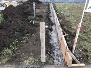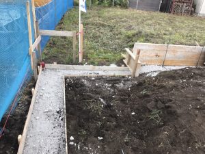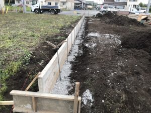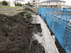 今日は宇都宮市 S町の境界基礎立ち上がり部分のベース部の掘削、砕石敷き、鉄筋配筋、型枠組の作業と、