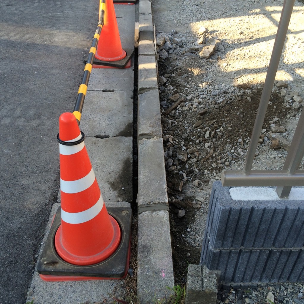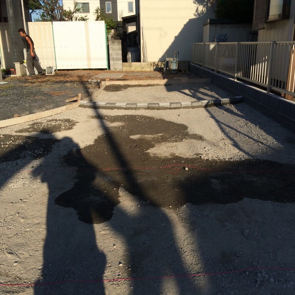 今日は宇都宮市 S町の砕石敷き、整地、駐車場土間コンクリート部の目地の見切インター伏せ、歩車道ブロックの補修の作業と
