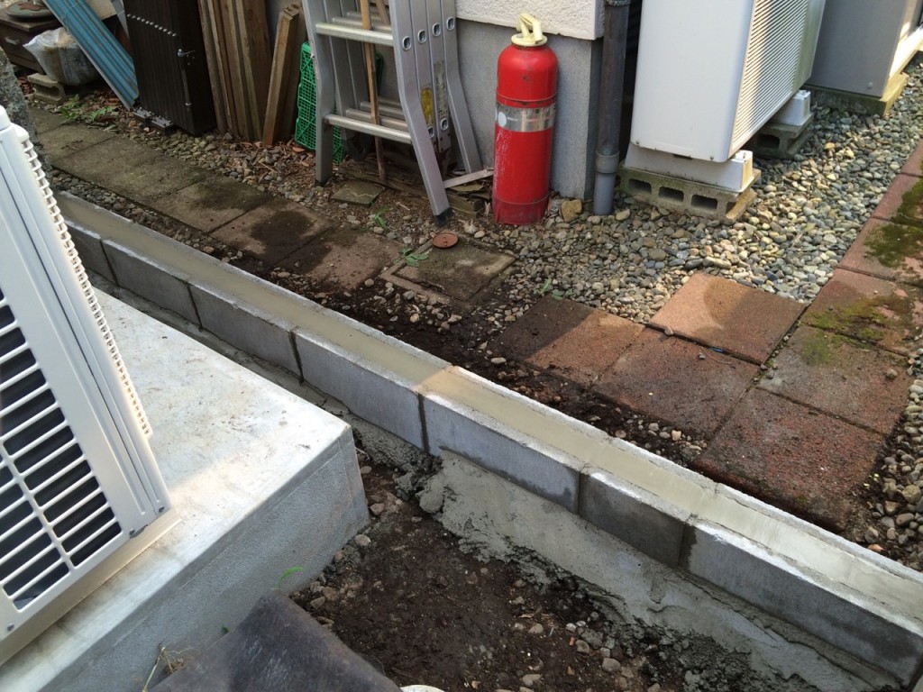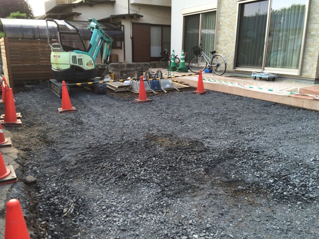 今日は駐車場土間コンクリートの掘削、砕石敷き、建物周り土入れ整地、防草シート敷き、土留ブロック積の作業をしました。