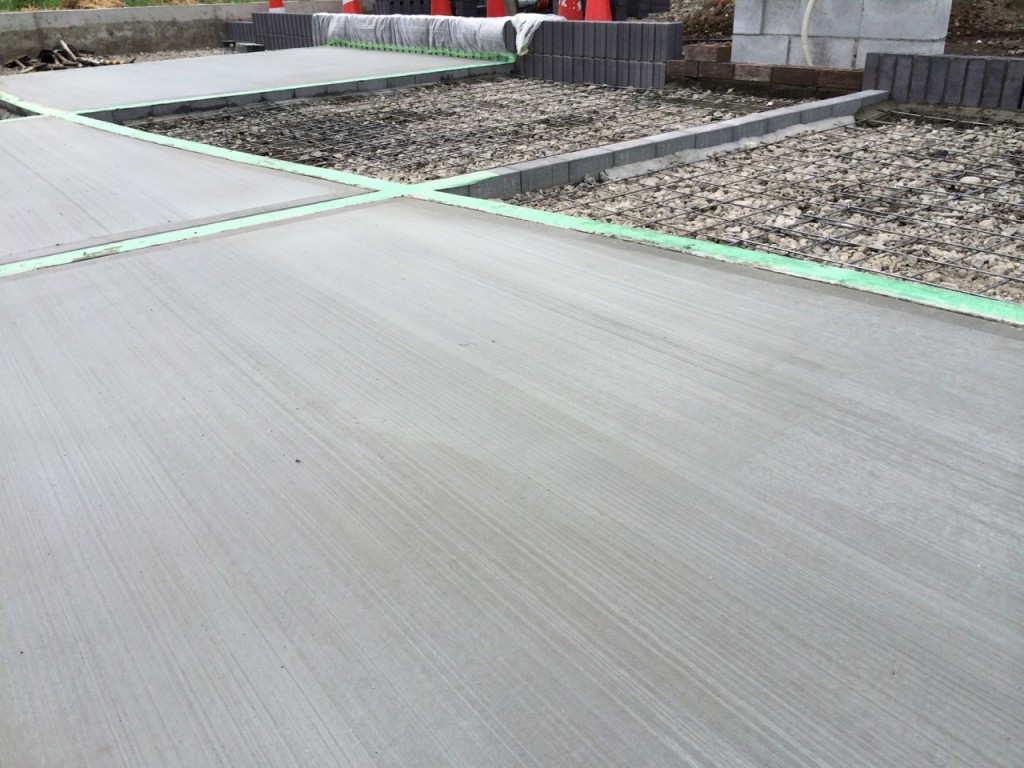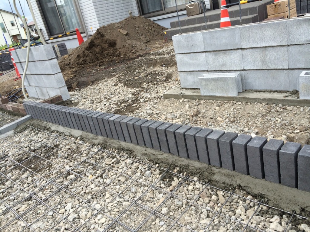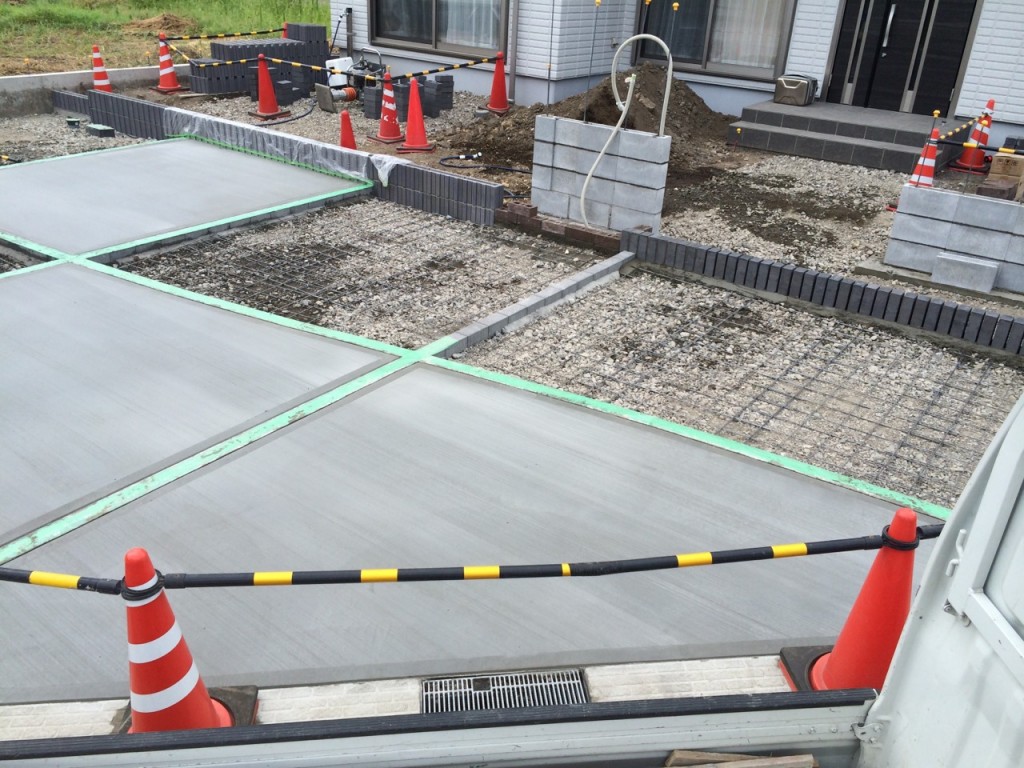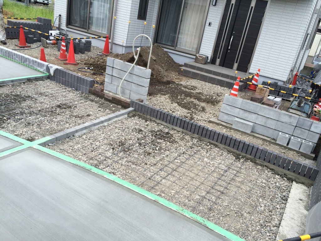 今日は宇都宮市 T町 K様邸の駐車場土間コンクリート打設、アプローチ部レンガ小端立て、
