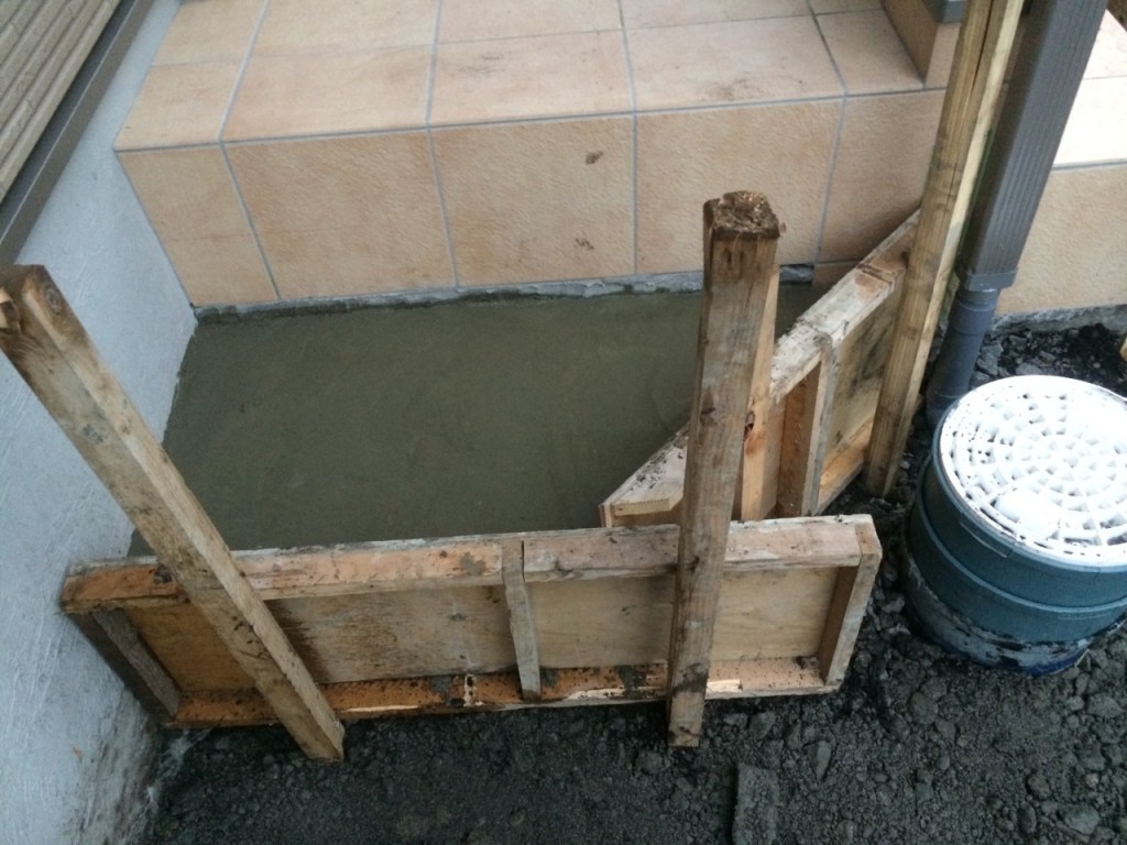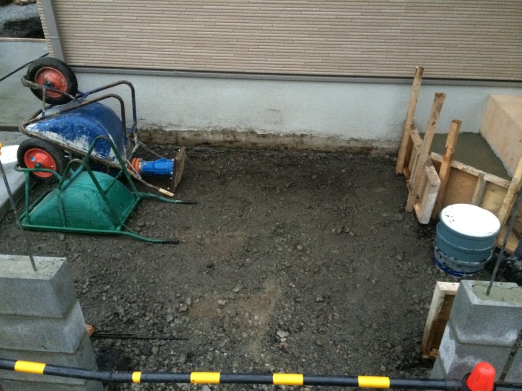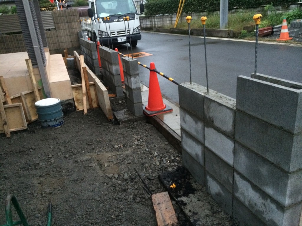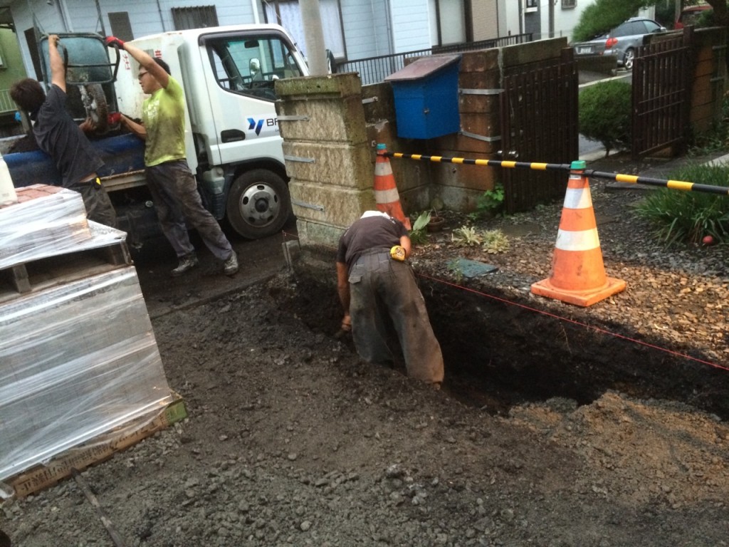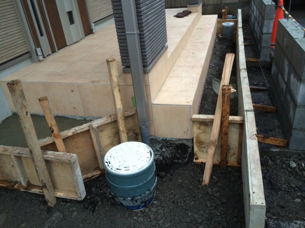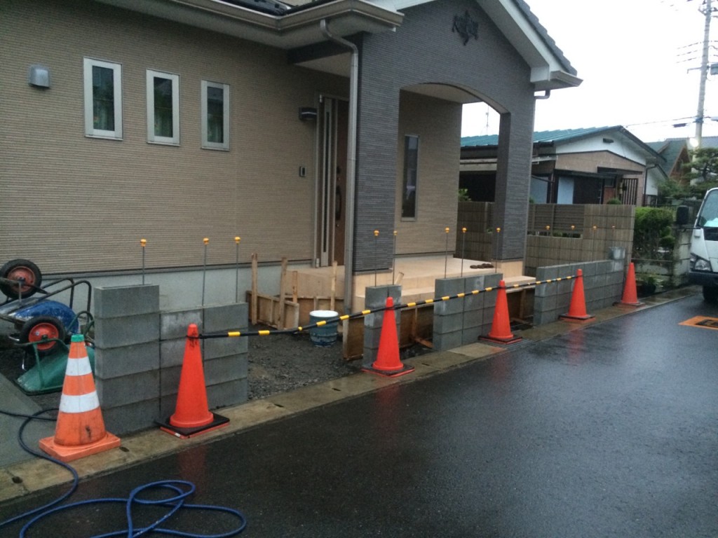 宇都宮市 S町の既存ブロック塀解体、門柱ブロック積、玄関ポーチ部ステップ1段足し打ち、6号砕石敷き