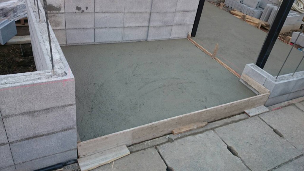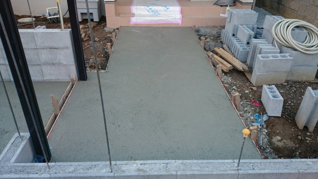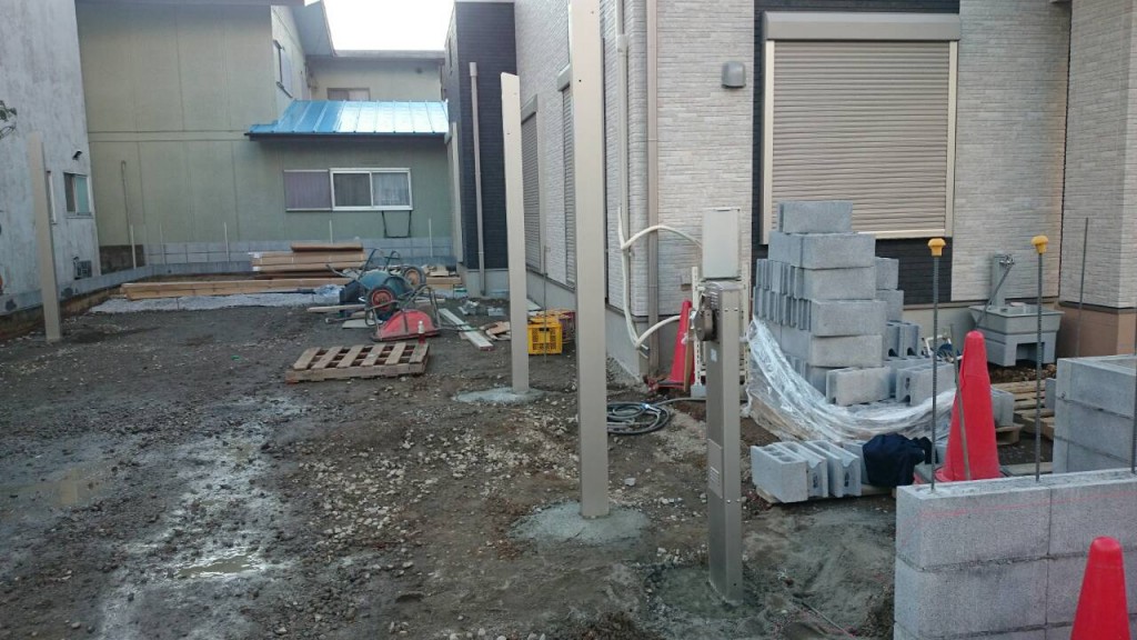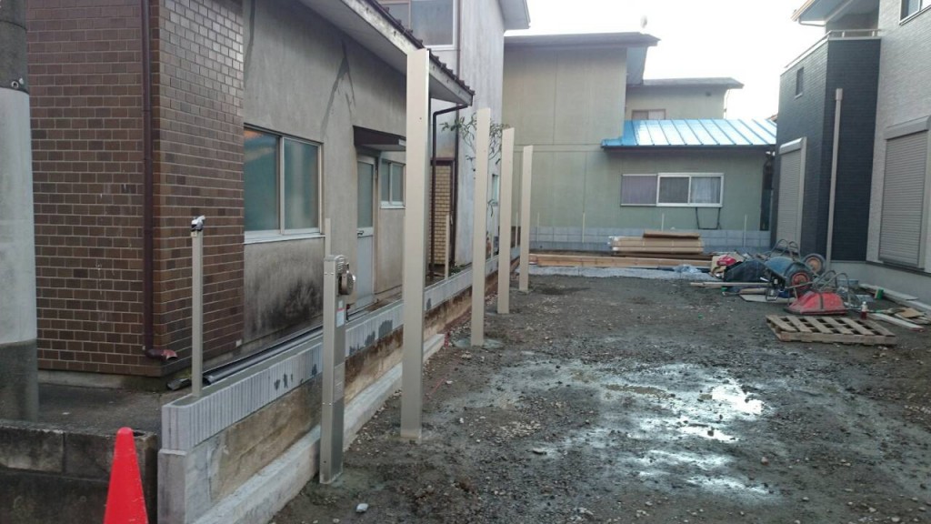 宇都宮市 I町 の現場でカーポートの柱立てと、パワーゲートの柱立て、玄関前アプローチの基礎の生コン打ちの作業と、