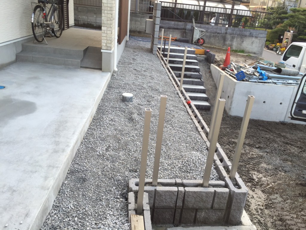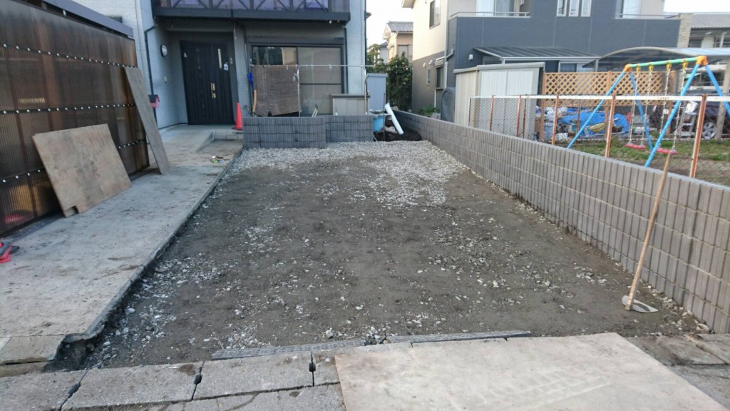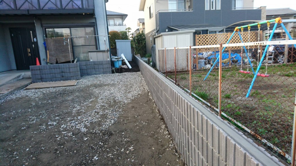 宇都宮市 H町 T様邸のブロック天端仕上、ブロックベース部埋戻し、駐車場土間コン部掘削、砕石敷きの作業をしました。